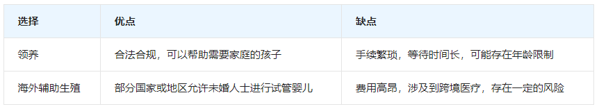对于未婚人士来说,如果希望拥有自己的孩子,可以考虑以下几种选择: