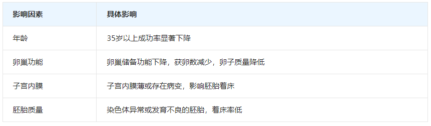 年龄:女性年龄是影响试管婴儿成功率最重要的因素之一。年龄越大,卵巢功能越下降,卵子质量越差,成功率越低。